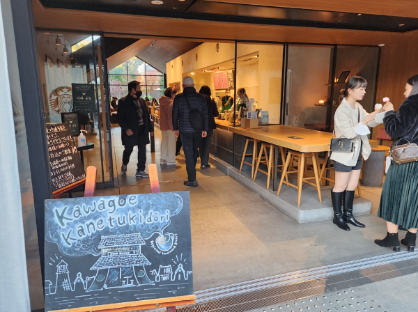 가와고에의 랜드마크는 시간을 알리는 종탑이다. 이것도 소실되었다가 메이지 왕의 격려금으로 다시 지었다고 하며 우리는 그 골목길의 목조건물 스타벅스에 들어가 아메리카노 커피(여행사의 웰컴 드링크)를 마셨다.