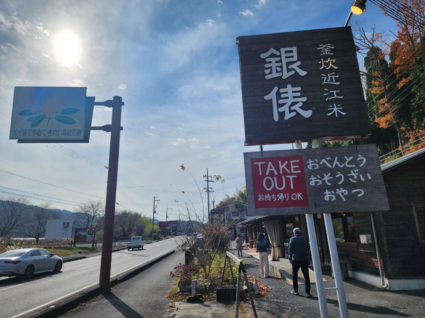 입간판에 맛있는 '오미에 쌀을 밥솥에 지은'(釜炊近江米) 긴다와라(銀俵) 음식점 Take out OK라고 쓰여 있었다. 주된 메뉴는 임연수 구이와 닭고기였다. 쌀도 좋고 물도 좋아 그런지 생각보다 맛 있었다. 경기도 이천 국도변의 밥집 같았다.