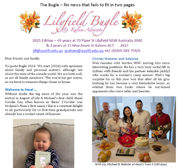 2] 내가 우리집 가족신문을 만들게 된 것은 호주 뉴사우스웨일스 대학교(UNSW)의 그레이엄 그린리프 교수님이 해마다 연하장처럼 보내주시는 Lilyfield Bugle (Lilyfield는 교수님 부부가 49년째 살고 있는 시드니 교외의 작은도시 이름임)이라는 가족신문이 직접적인 계기가 되었다. 교수님 내외분이 우리집을 방문하신 적이 있는 만큼 1년간의 가족 소식을 전하는데 이처럼 좋은 수단이 없었기 때문이다. 그래서 제7호부터는 판형과 사진을 그대로 유지한 채 기사만 간결하게 번역하기로 하고 Gemini AI Plus의 도움을 받았다(위의 두 번째 사진).